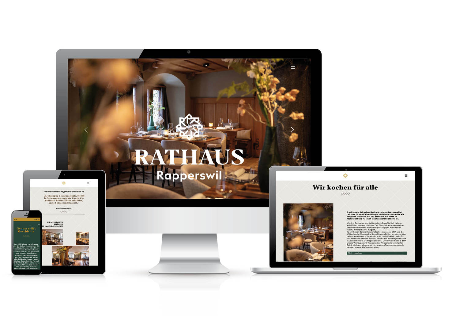 Genuss trifft Geschichte: Das Restaurant Rathaus in Rapperswil verbindet historische Substanz mit moderner Gastlichkeit. Wo einst über die Zukunft der Stadt entschieden wurde, wählen heute Gäste ihre Lieblingsgerichte. Die alten Balken in den historischen Räumlichkeiten erzählen von vergangenen Zeiten. Quersicht übersetzt diese Atmosphäre in ein ganzheitliches Erscheinungsbild und eine stimmige Bildwelt – die Website bildet dabei das digitale Herzstück des Auftritts und macht die besondere Stimmung des Hauses auch online erlebbar.